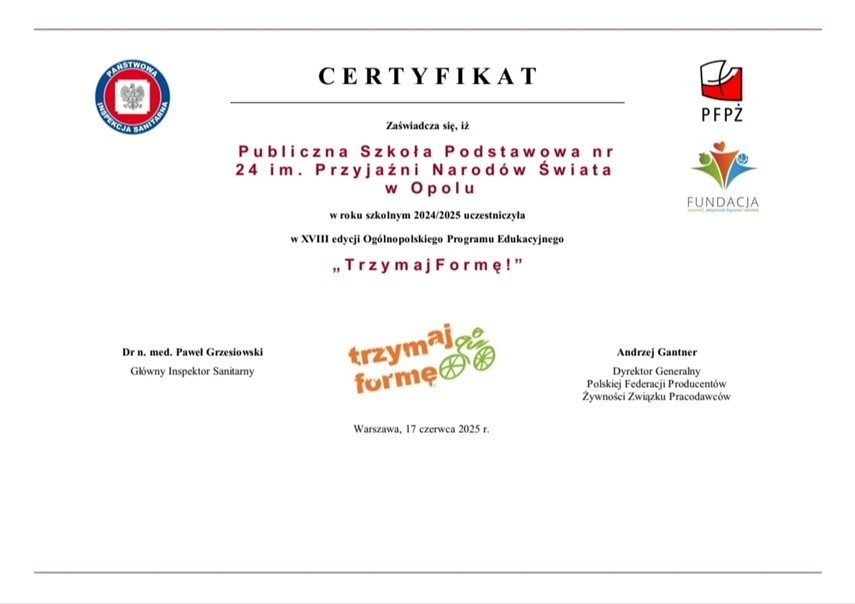Certyfikat uczestnictwa w XVIII edycji Ogólnopolskiego programu „Trzymaj Formę” w roku szkolnym 2024/2025